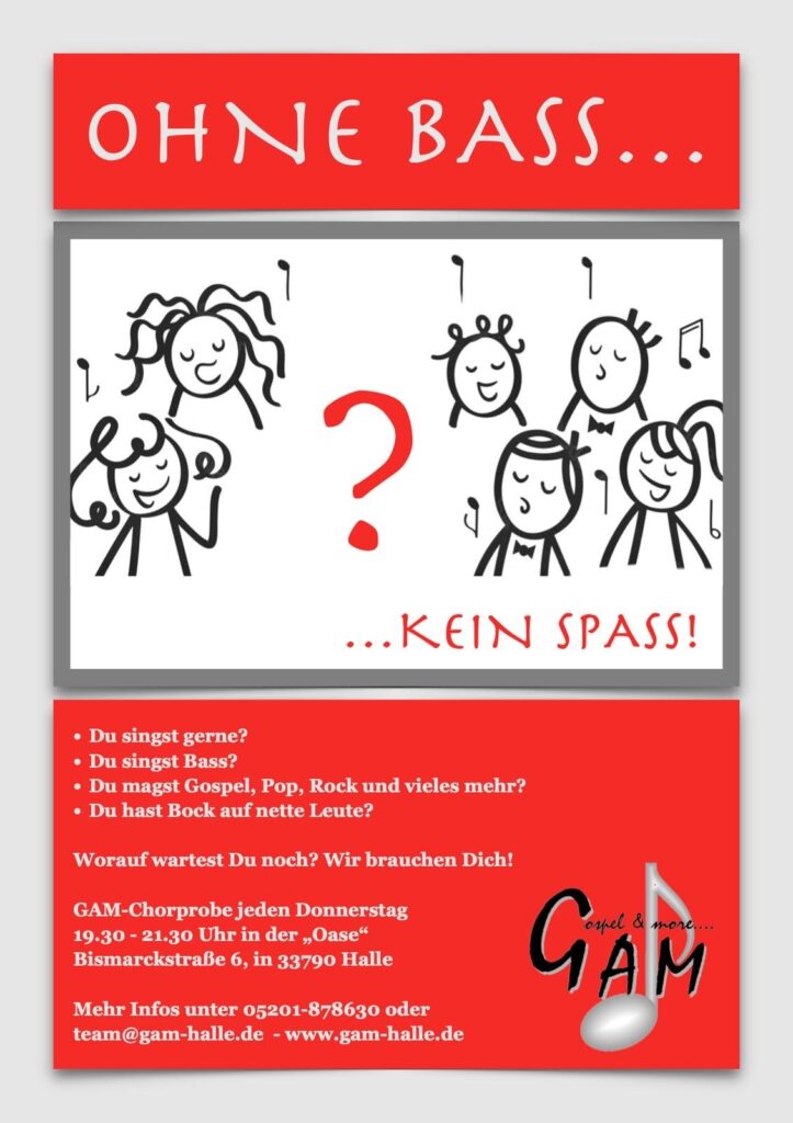 | Musikalische Leitung: Michael Kuhnen michael@gam-halle de | Postadresse: Gospelchor GAM c/o Pfarrbüro Herz Jesu Bismarckstraße 13 D-33790 Halle (Westf.) | Organisatorisches Team (GAM-Team): Antje Enkemann-Schneider, Stefanie Kombrink, Verena Kozianka, Evelyn Kraemer, Alexandra Tippe und Tina Wilke team@gam-halle de | |||||||||